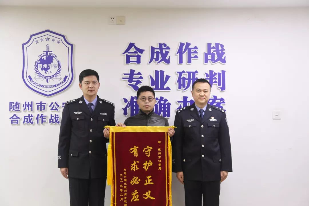 2019年2月27日,东莞市湖北随州商会秘书长胡吉江、商会常务副会长姜涛一行在市招商局副局长钱涛、随州市驻深办主任杨红强等人的陪同下,将一面“守护正义、有求必应”的锦旗送到随州市公安局,对随州警方快速破获盗窃车内财物案表示感谢。