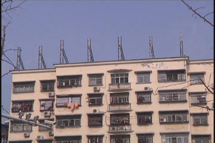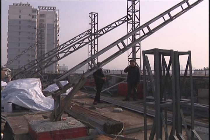 亚通社区35号楼就位于新中百购物中心对面,属于临街楼层,楼下就是人行道,也有不少店铺。记者从楼下观察,楼顶已经架起了好几个铁架子,准备作为安装广告牌的支撑。