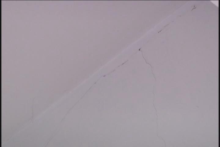 而住在顶层的居民住宅因为广告牌的基座施工也遭了秧。在7楼一名刚装修的住户家中,位于楼顶钢架施工正下方的墙面已经出现了不少裂缝。