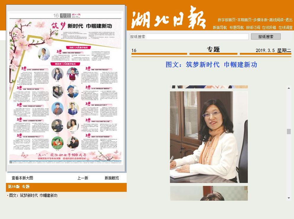 3月5日,《湖北日报》专版刊登三八红旗手标兵事迹,曾都区何店镇党委委员、副镇长、妇联主席刘锦华榜上有名。