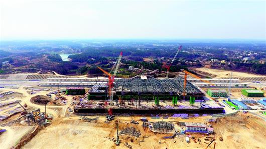 图为:汉十高铁随州南站及站前广场建设快速推进,预计今年11月可全面建成。图为3月14日正在建设中的随州南站工地。(徐斌 摄)