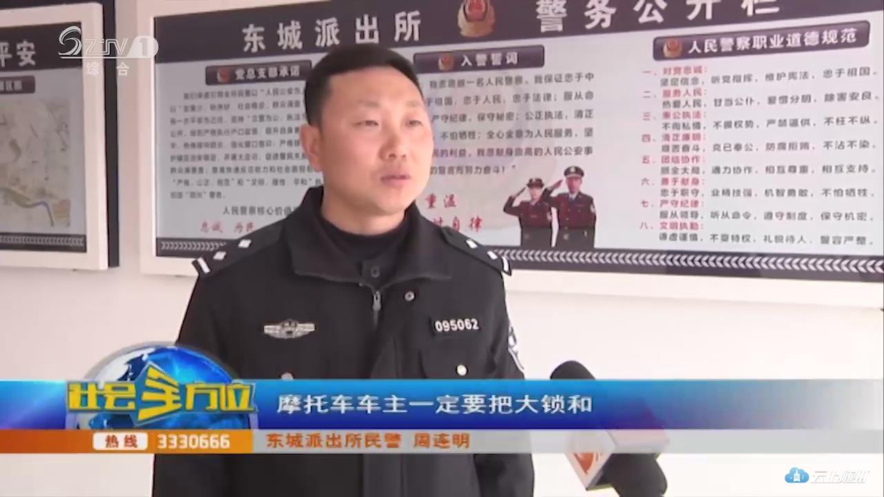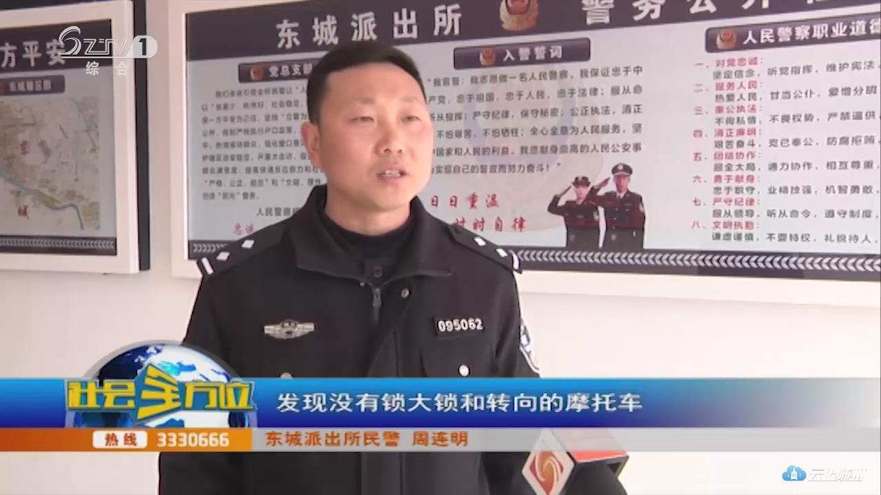 【采访】东城派出所民警 周连明:摩托车车主一定要把大锁和摩托车转向锁锁好,停在自己视线所及的范围内,摩托车被盗以后,要及时报案,一方面便于警方侦破案件,以及侦破案件盗窃团伙后,能够最快的将摩托车发还。