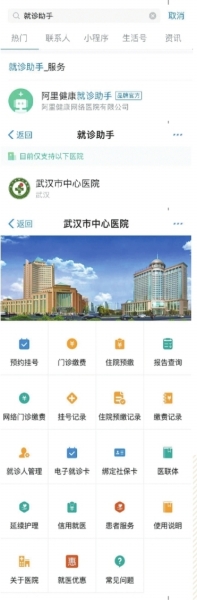 阿里健康互联网医疗负责人邵双介绍,“未来医院”上线后,患者只需在支付宝首页搜索关键词“就诊助手”,即可打开小程序。在“已开通医院列表”中选择武汉市中心医院,补充就诊者个人信息,绑定社保卡、电子健康卡后,即可实现包括预约挂号、院内导航、门诊缴费、报告查询在内的20个功能,基本覆盖一名普通患者就医的全流程。