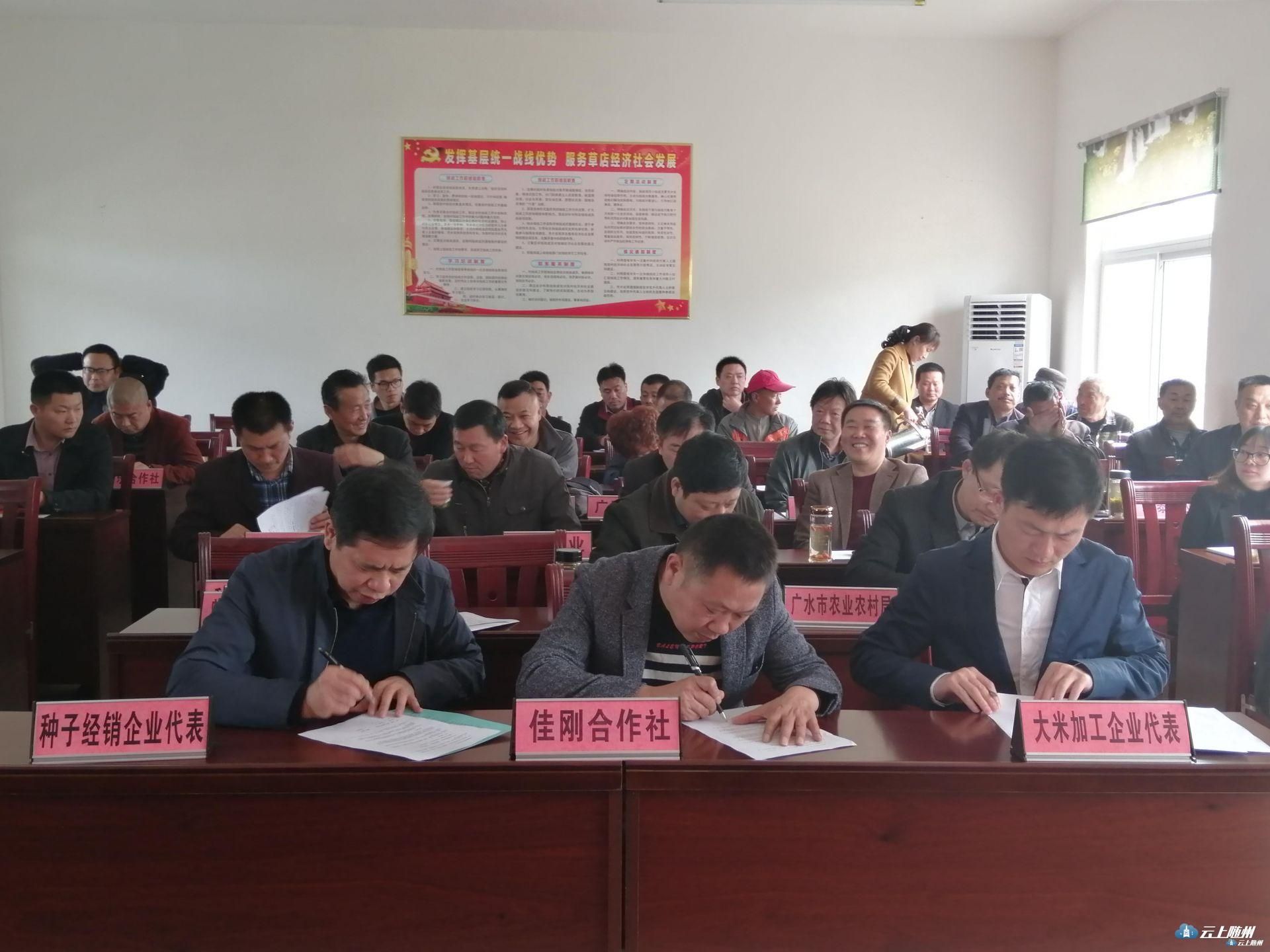 会上,吴正江主任宣读了《随州市第二届优质大米品牌品鉴活动评选结果》,通报了6个获奖企业和稻米品牌;市农技推广中心主任李进山同志宣读了市农业农村局关于印发《2019年随州市优质稻产业发展实施方案》的通知;局种植业科负责人张坚同志宣读了《关于印发<市农业农村局中央脱贫攻坚专项巡视反馈意见整改工作方案>的通知》;市稻米产业协会秘书长、大自然米业总经理陈实宣读了协会交流联系群有关纪律要求。会上还进行了“双订单”签字仪式,随州市广舜种业、新华米业分别与贫困户代表签订了免费供种协议和加价收购合同,随州市瑞泰农业公司、大自然米业分别与佳刚种植合作社签订了优质稻“双订单”生产合同和加价收购协议。