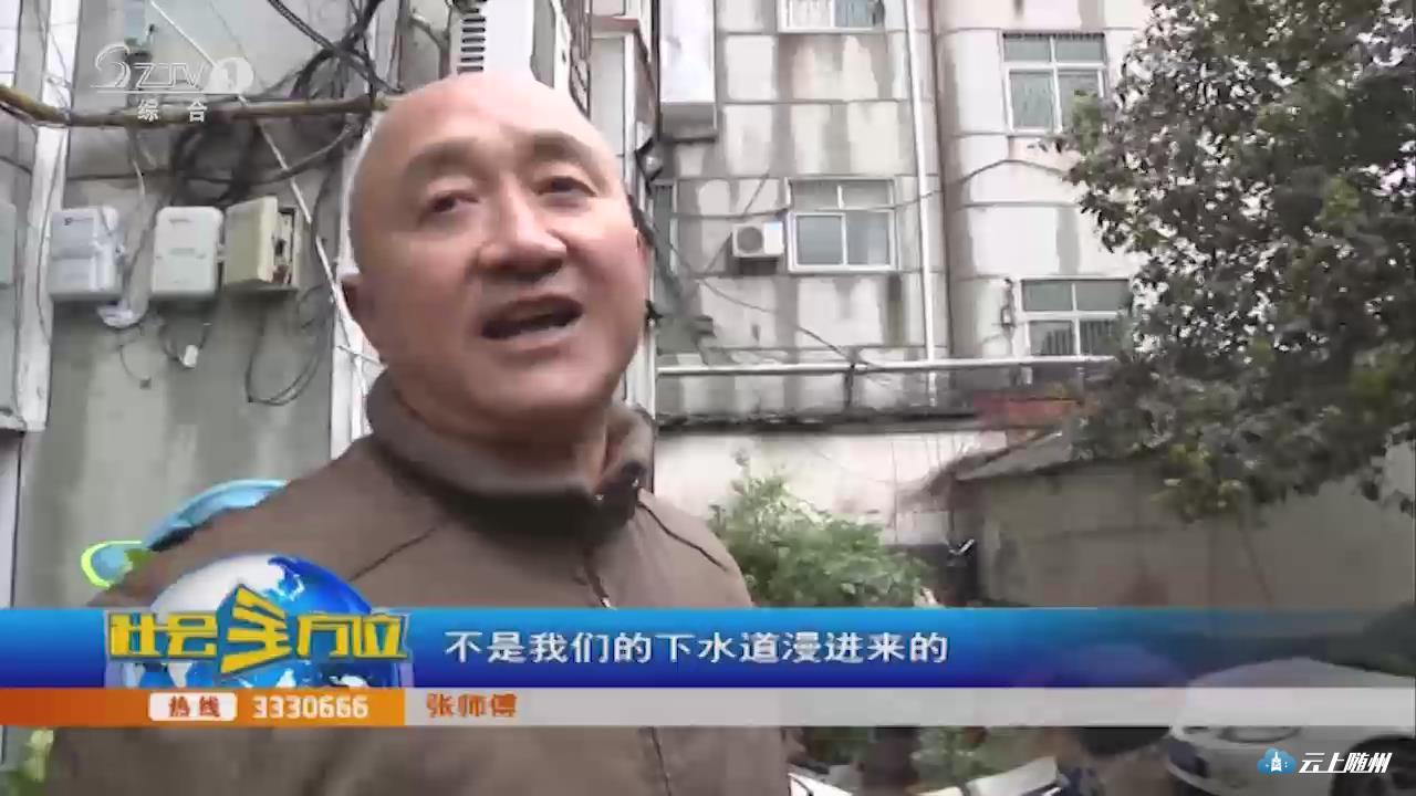 【采访】张师傅:上面的水比下水道深,再就是施工把门口的场子高度降低了,上面的水全部从大门涌进来,不是我们的下水道漫进来的,下水道漫的数量有限,绝大部分是从外面大门口翻涌进来的。