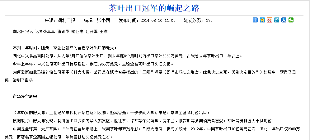 点评:和曾经的随县香菇一样,又是“墙内开花墙外香”。很多随州人在喝外地茶,还有人在喝进口茶,但是很多老外在喝随县茶。