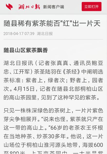 近几年,随县茶声名鹊起,不仅出口量创下全省“六连冠”,而且发现茶中珍稀品种——紫茶。