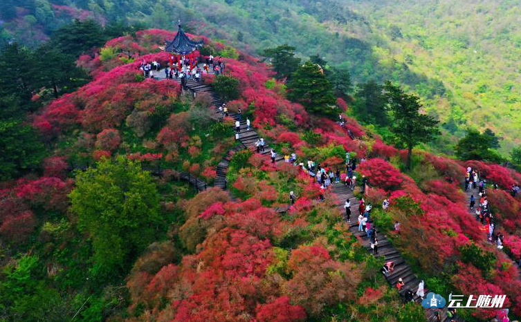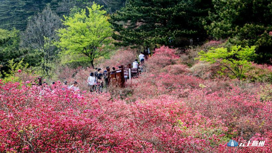 4月20日,游客在龟峰山的杜鹃花海游玩。近日,湖北省麻城市龟峰山的古杜鹃花盛开,大量游客前来赏花观景。