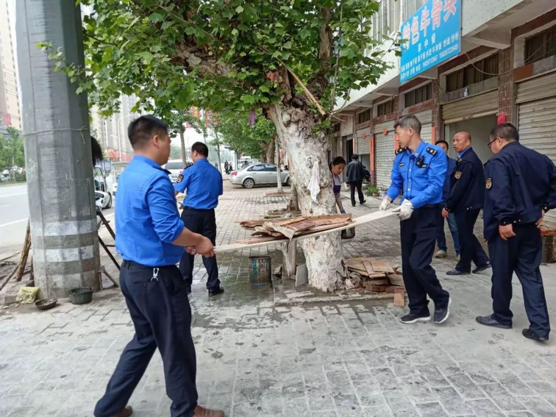 4月24日早上7:30,府河镇对向光街沿线市容环境进行集中整治。此次行动共清理遮阳棚13个,清运商户门前杂物7车,劝导出店经营商户5户,清除“牛皮癣”56处,拆除广告牌28个。