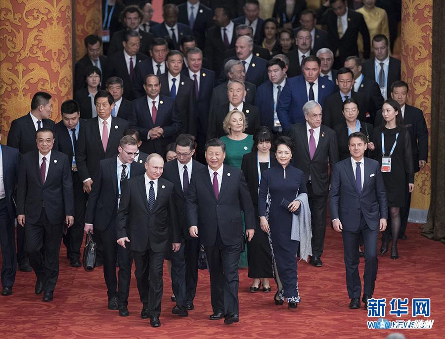 4月26日,国家主席习近平和夫人彭丽媛在北京人民大会堂举行宴会,欢迎出席第二届“一带一路”国际合作高峰论坛的外方领导人夫妇及嘉宾。这是习近平和彭丽媛同贵宾们一同步入宴会厅。 新华社记者 王晔 摄