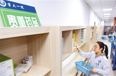 吉林大学白求恩第一医院医生在药房给患者取药。