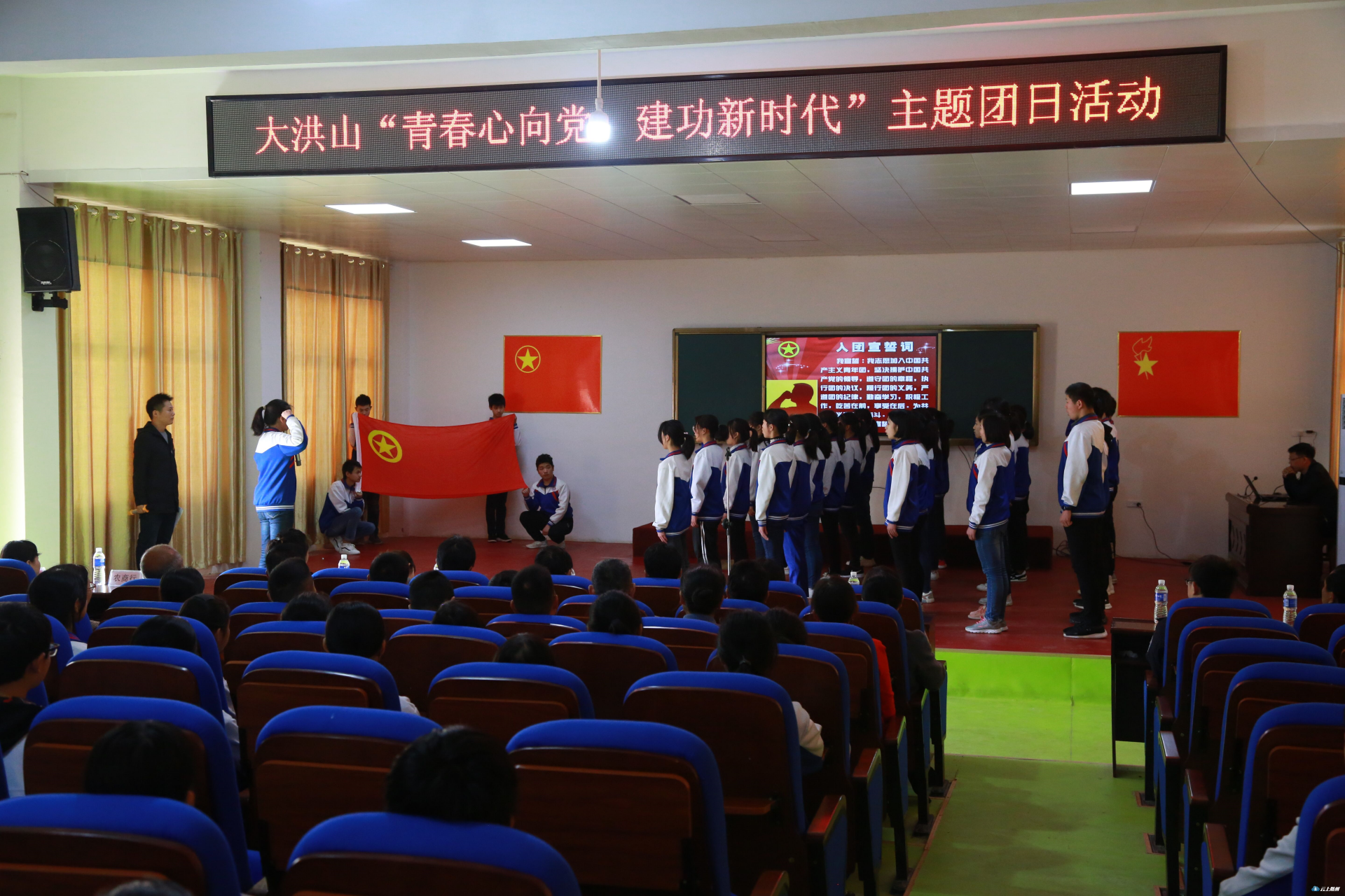 在长岗镇中心学校,新团员在领誓人的引导下进行了庄严的宣誓:“我志愿加入中国共产主义青年团!”洪亮坚定的青春誓言,表达了全区青少年们对共青团组织的无限向往和为团组织增光添彩的豪迈激情。
