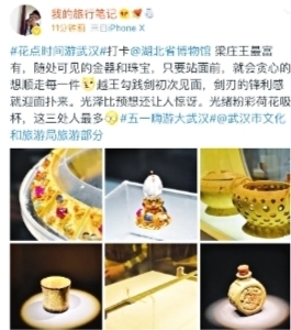 拥有41万粉丝的微博达人“迷途的小柒”来自西安,她第一次来到武汉,“当超越时空的越王勾践剑,影响深远的云梦睡虎地秦简,2400多年历史的曾侯乙编钟,还有很多穿越千年的国家宝藏,真正出现在眼前,你会感觉到自己有多渺小。”“迷途的小柒”说,湖北省博物馆安静却不失气势地静静矗立在东湖之滨,自带穿越感的高颜值。