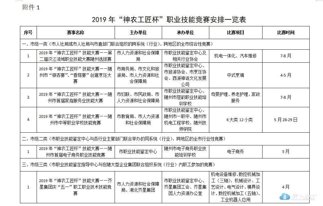 附件: 1.2019年“神农工匠杯”职业技能竞赛安排一览表