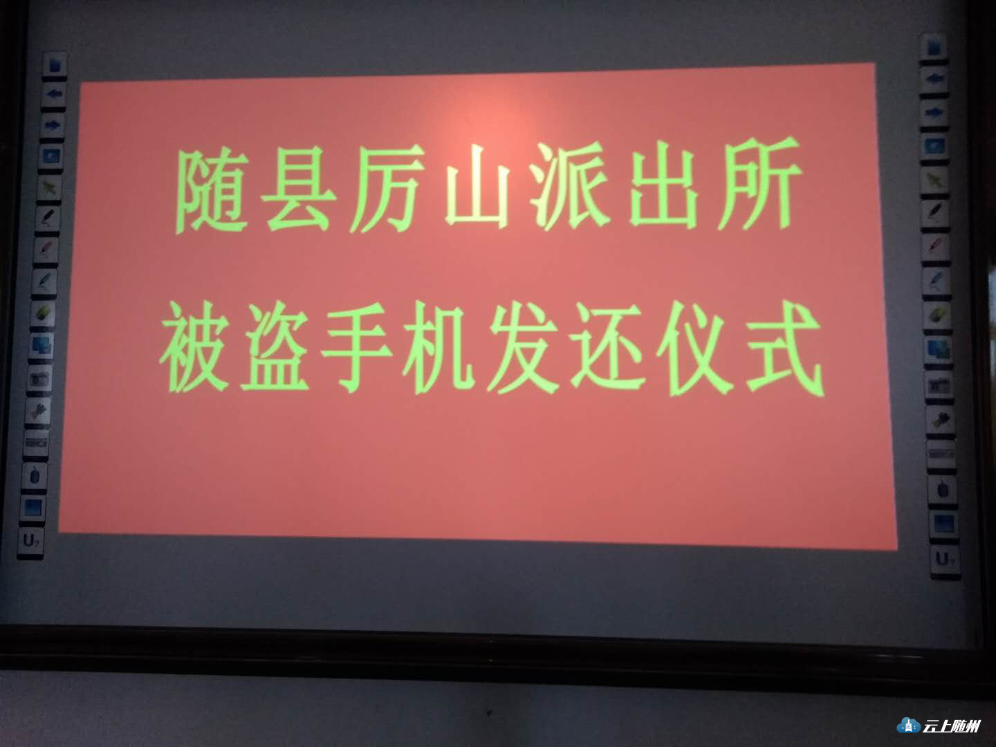 5月14日15时,随县公安局厉山派出所在随县职教中心会议室内举行被盗手机发还仪式。厉山派出所教导员宋立明亲自将追回的七部手机交还给失主,随县职教中心庞校长代表学生失主表达了真诚感谢!