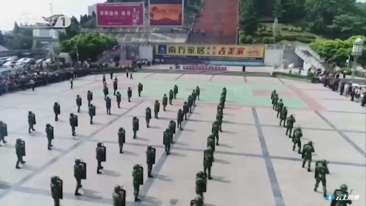 演练现场,武警随州支队的官兵和市公安局特警支队的民警分别展示了实战背景下的反恐处突演练。武警战士首先进行了刺杀操、警棍盾牌术以防爆队形的相关展示。