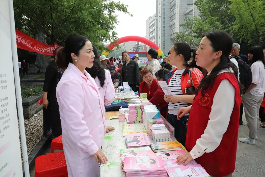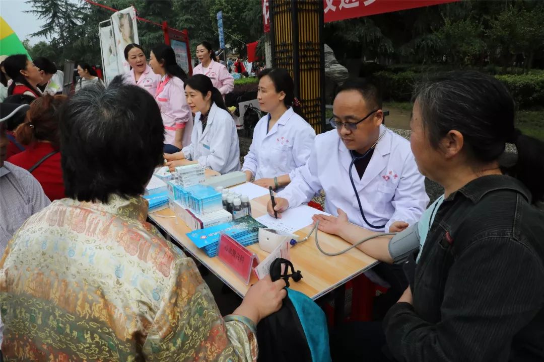 在曾都区卫生健康局展台前,医生为市民测量血压、血糖,发放免费药品,耐心为女市民讲解保健知识;