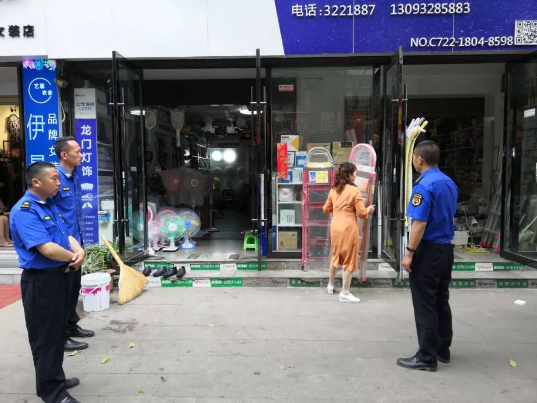 5月19日上午,北郊办事处环境综合整治工作专班和城管执法局、市场监管所、黄龙社区等单位联合行动,分别对花溪巷、烈山大道的出店经营、流动摊贩和环境卫生进行常态化整治。劝退流动摊贩6家,暂扣出店经营违规摆放物品1家。