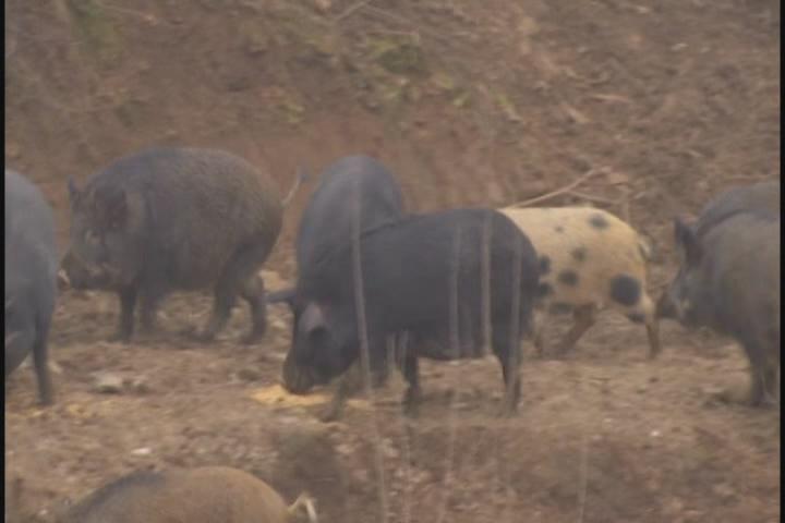【采访】万蛟:家猪和野猪的习性我们都是比较了解的,野猪就是耐寒耐粗饲料,体力好,在山上能够找到很多他们需要的食物,家猪就比较懒惰一点,这种混养的模式的话,野猪就可以带着家猪找一些食物,和他们身体所需的微量元素。