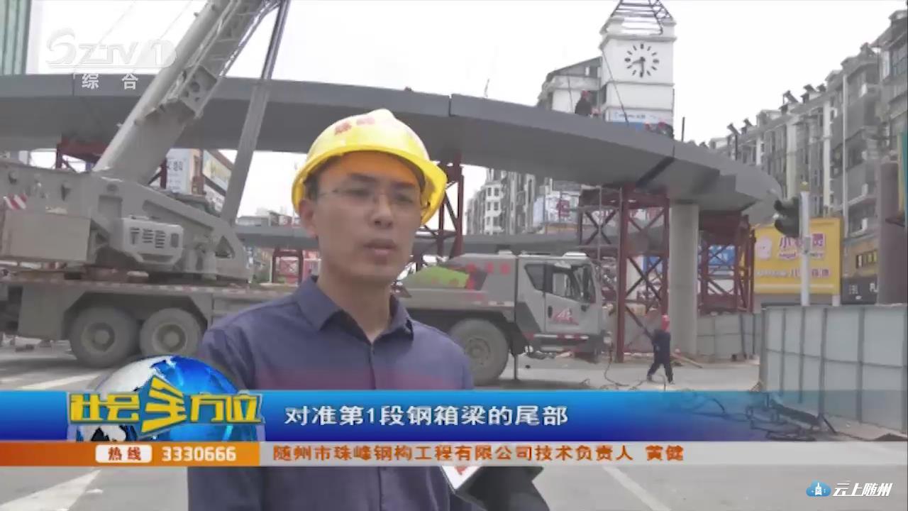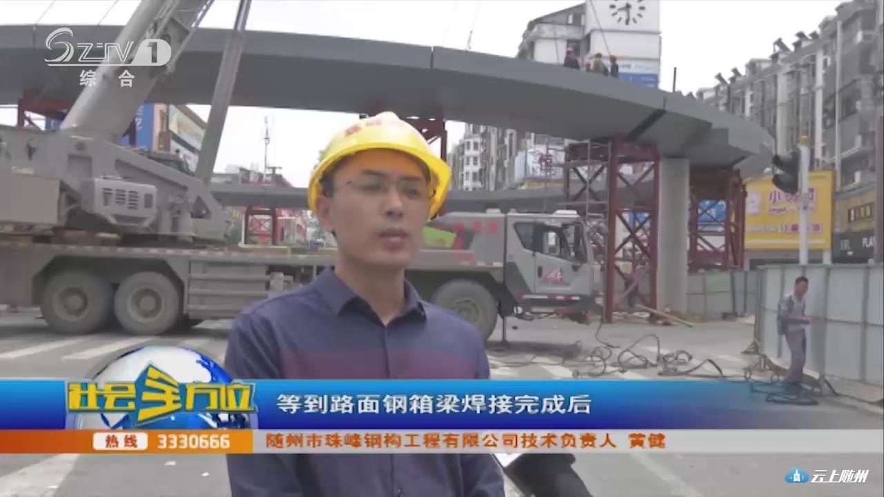 【采访】随州市珠峰钢构工程有限公司技术负责人 黄健:最后一段钢箱梁目前顺利精准吊装在支撑架上,这16段钢箱梁,第1段钢箱梁和第16段钢箱梁是工程的最难点,第1段钢箱梁需要控制好准确的尺寸,最后一段钢箱梁要保证完全合拢,对准第1段钢箱梁的尾部,形成一个整体圆环。