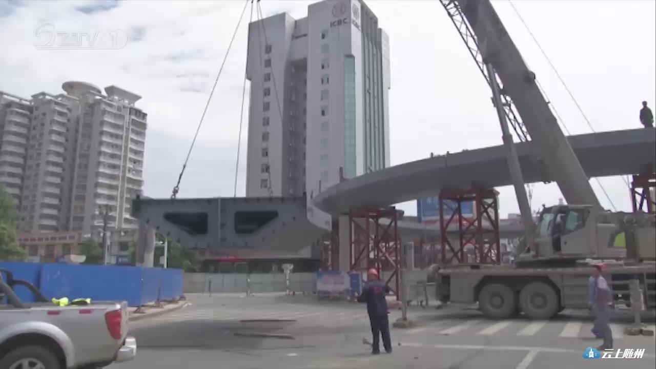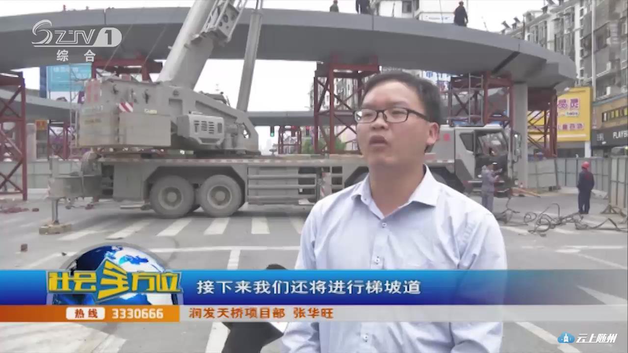 【采访】大润发天桥项目部 张华旺:大润发天桥圆环钢箱梁吊装施工今天已经施工完毕,按照施工计划,接下来我们还将进行梯坡道,天桥铺装及附属工程施工,整个天桥预计在8月底建成通行,后续施工请过往车辆减速慢行,注意安全。
