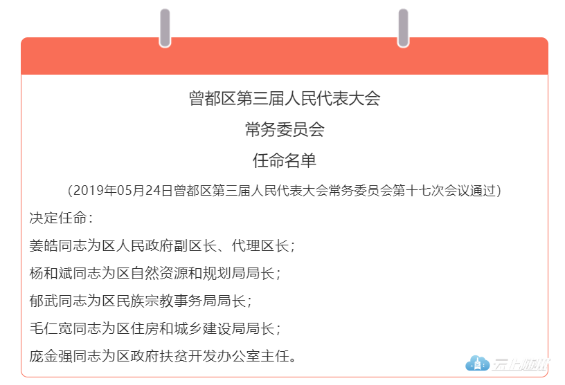 会议表决通过了关于接受张健辞去曾都区人民政府区长、曾都区三届人大代表职务请求的决定。根据曾都区人大常委会主任会议提名,任命姜皓为曾都区人民政府副区长、决定其为代理区长。姜皓在会上进行了宪法宣誓。