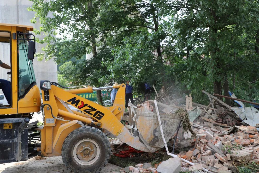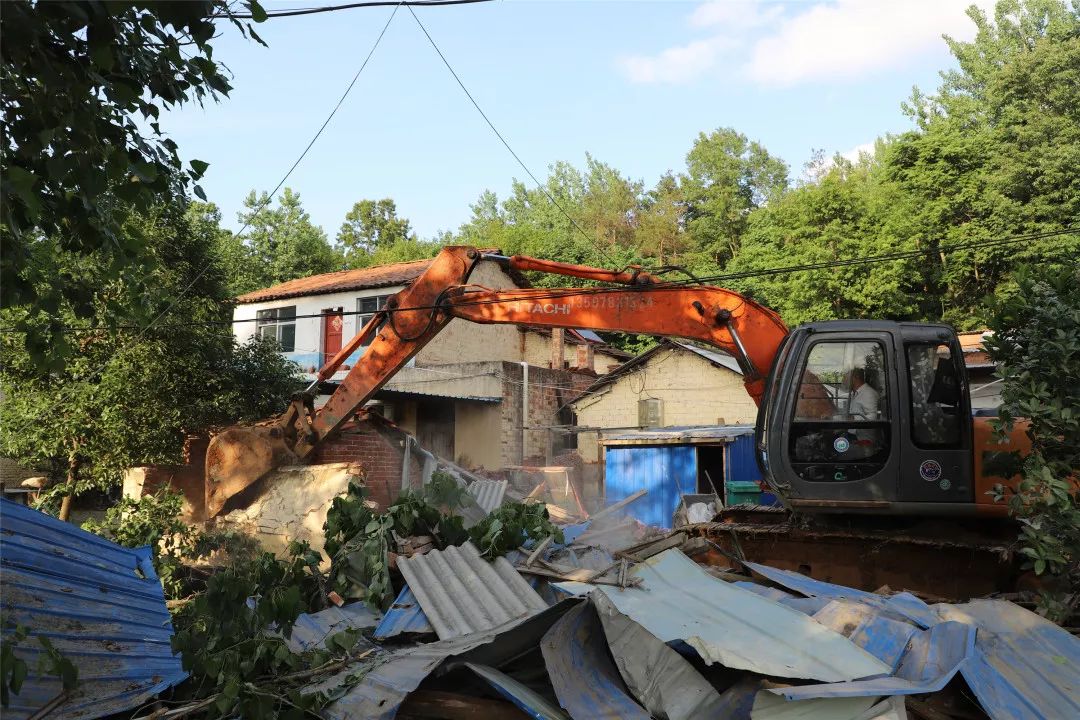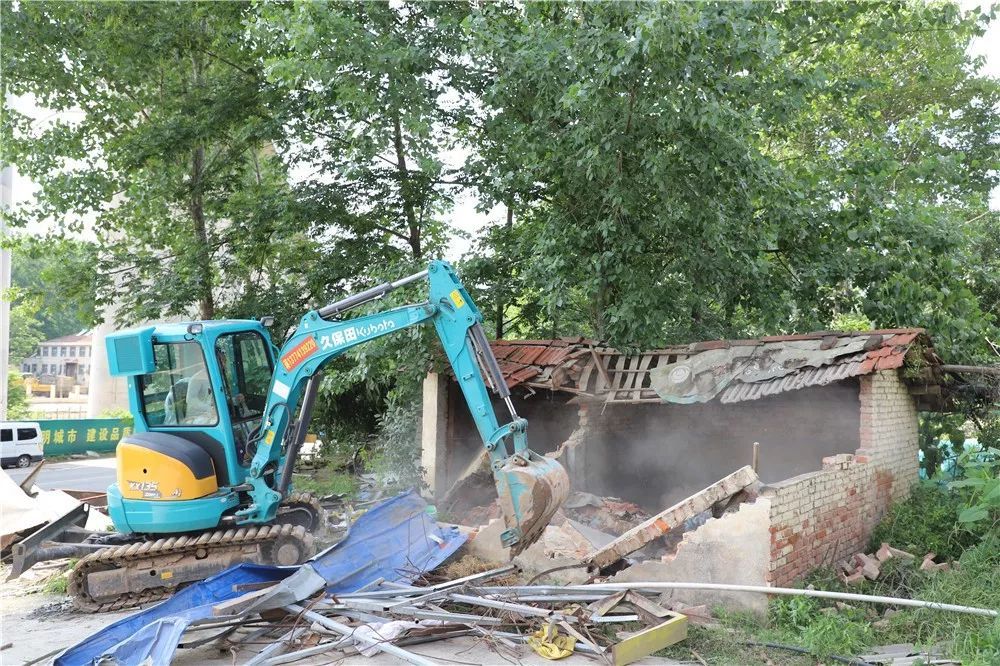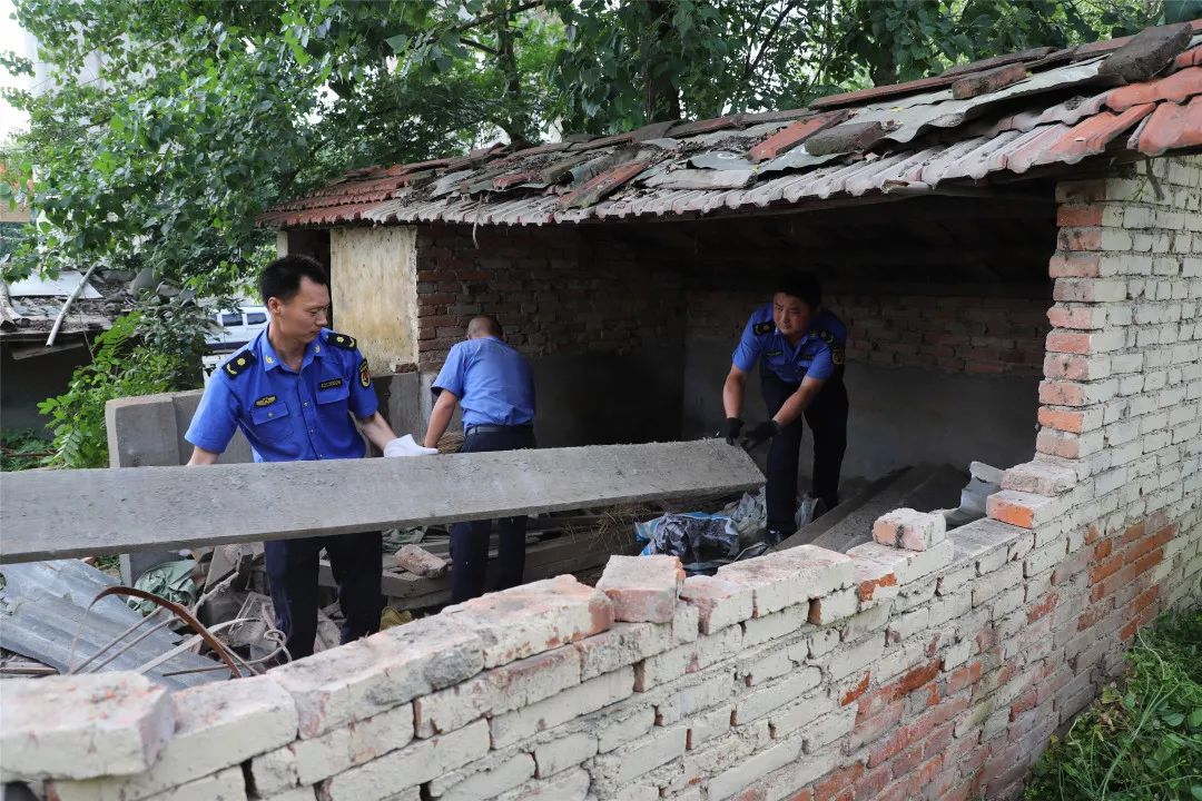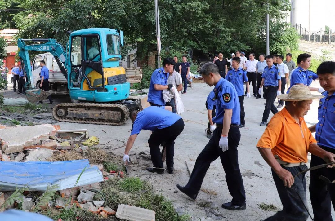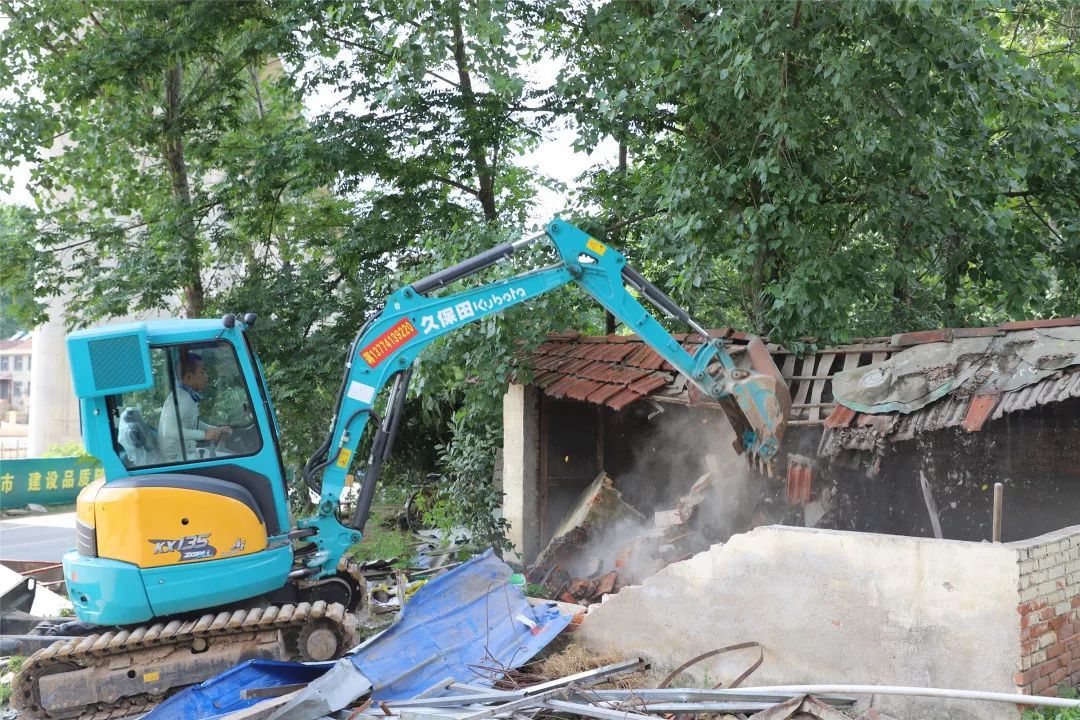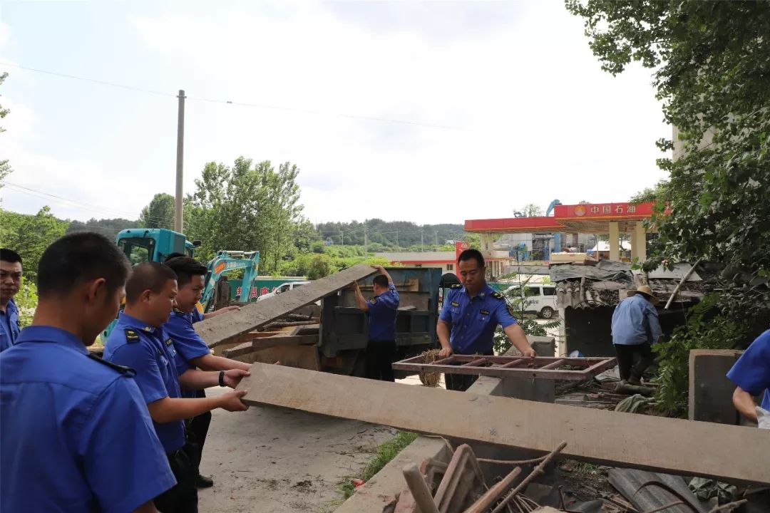 在炎帝大道均川路口加油站附近,有多处违章建筑物,市、区城管执法队员、南郊办事处干部现场进行拆除。