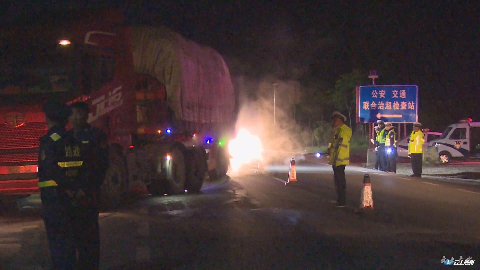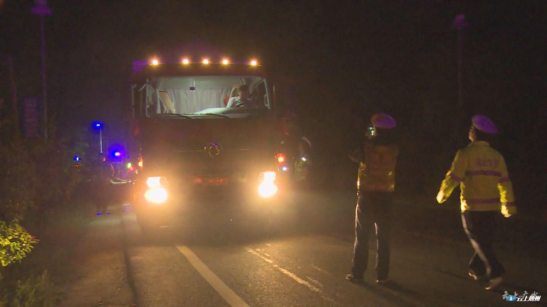 【同期声】广水市公路管理局路政大队副大队长 余斌:“广水市治超工作专题会后,我们迅速落实会议精神,进一步加大治超力度。5月22日晚,广水路政大队霞家河超限检测站和交警、运管部门在107国道东余店路段对过往车辆进行检查,现场查扣非法改装及违法超限超载车辆13台。目前已全部带回,正依法处理中。”