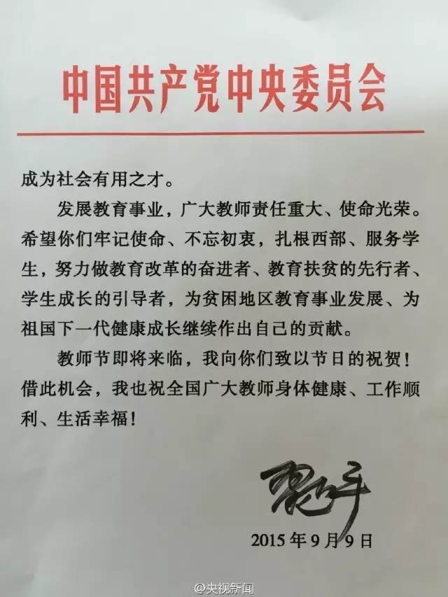 2015年9月9日,习近平给“国培计划(2014)”北京师范大学贵州研修班全体参训教师回信,对他们提出殷切希望,并向全国广大教师致以节日的祝贺和诚挚的祝福。