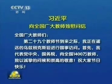 2013年的教师节,全国教师们收到了一封来自远方的慰问信。9月9日,远在乌兹别克斯坦进行国事访问的习近平向全国广大教师致以节日问候。