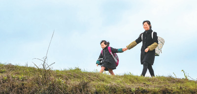 除了教孩子们学好功课,黄先群还承担起照顾孩子们的职责。图为她接上同路的孩子,一起去学校。