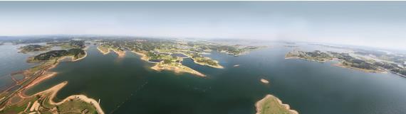 水库库面呈枫叶形,如明镜般镶嵌在百余里丘陵岗岭之间。库区内, 108岛点缀其中,曲水环山、回峰抱水,烟波浩淼,气候宜人。