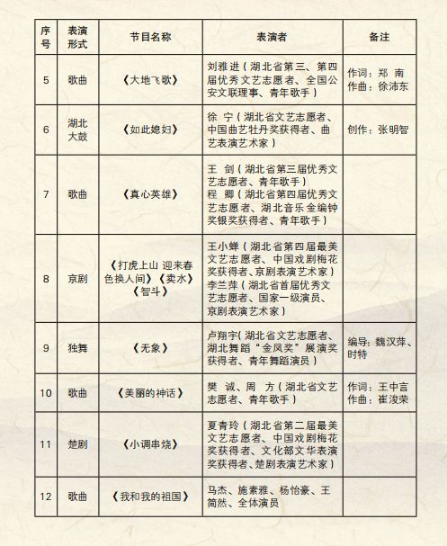 在彩排现场,省级文艺家们带来了不少精品节目,有黄梅戏《女驸马》选段《谁料皇榜中状元》和《天仙配》选段《夫妻双双把家还》、湖北大鼓《如此媳妇》、京剧《打虎上山 迎来春色换人间》和《智斗》、楚剧《小调串烧》等,戏韵声声入耳,一场文化大戏送到了老百姓的家门口。