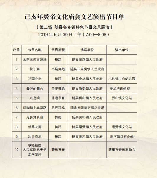 5月30日上午,己亥年炎帝文化庙会的舞台上热闹依旧,随县非遗展演、各乡镇特色节目、随州花鼓戏等一一精彩上演,用载歌载舞的形式向寻根节献礼。