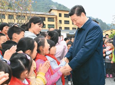 图为四月十五日下午,习近平在重庆石柱土家族自治县中益乡小学同学生们亲切交谈,询问他们学习和生活情况。