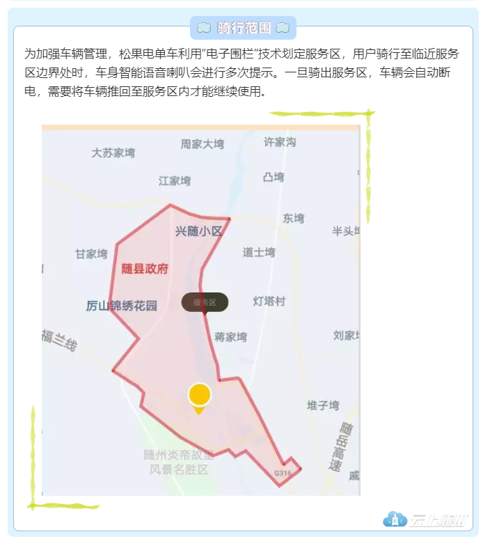 据松果电单车随县负责人介绍,在随县城区首批投放600辆电单车,投放范围北至随县政府、南至巴黎春天小区、西至神农大道、东至福兰线国道,让老百姓在家门口就能享受到更加便利的公共交通服务。