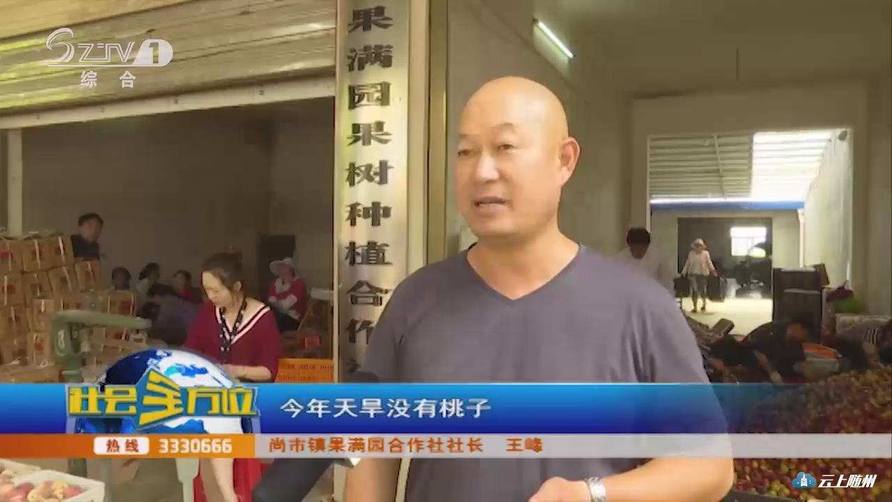 【采访】尚市镇果满园合作社社长 王峰:发货量现在一天大概10车到12车,关键是没有桃子,有桃子的话肯定会更多,我现在这里有全国各地的老板,都是到这里来等着收桃子的,(往年的情况怎么样?)往年我一天最多的时候发20多车,今年天旱没有桃子。