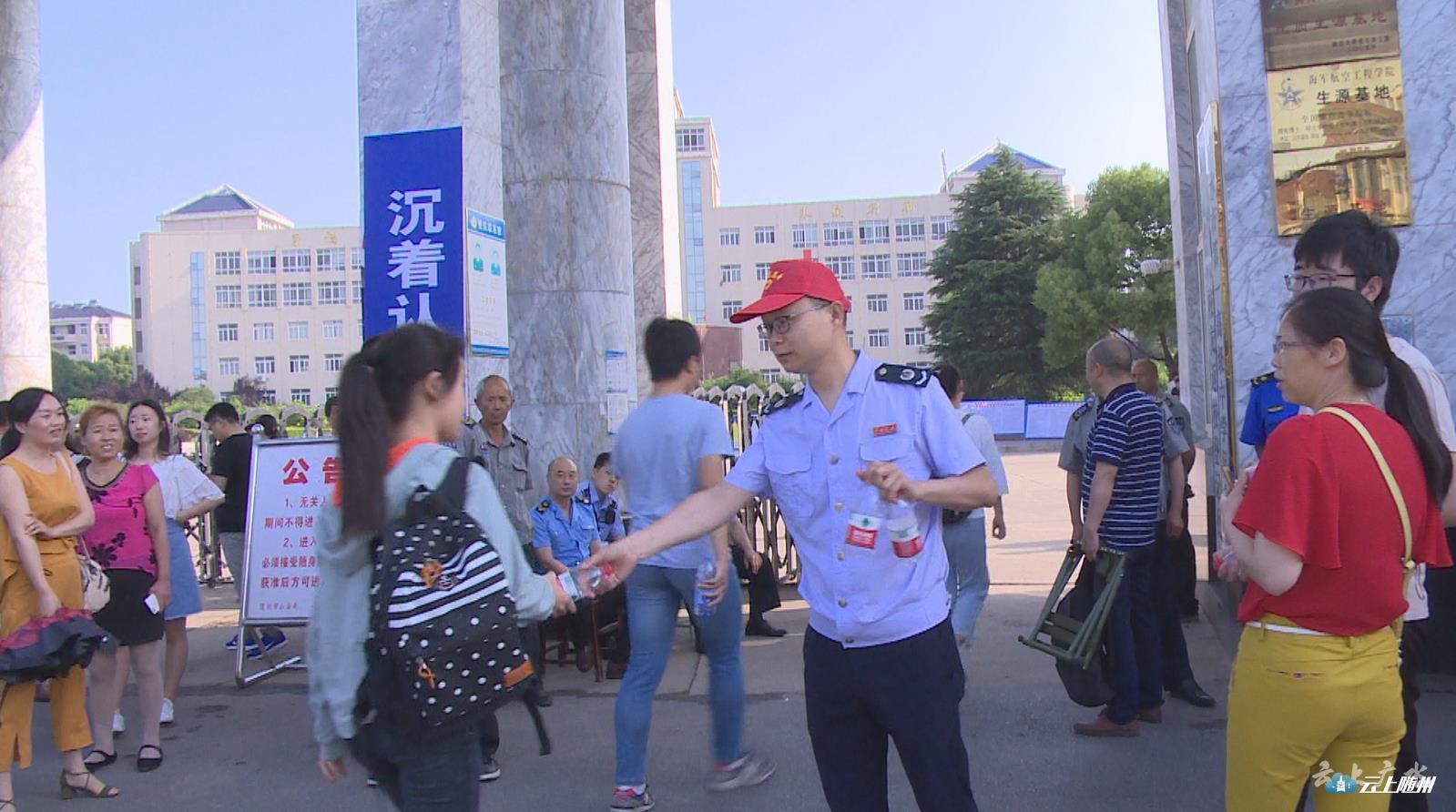 广水市出租车协会、市税务局、总工会等部门的志愿者也加入到了服务考生的大军中。在三个考点外,志愿者们为每一位考生发放矿泉水并准备了防暑药品以备不时之需。其中,市出租车协会抽调80台出租车,组织100余名志愿司机免费接送考生。