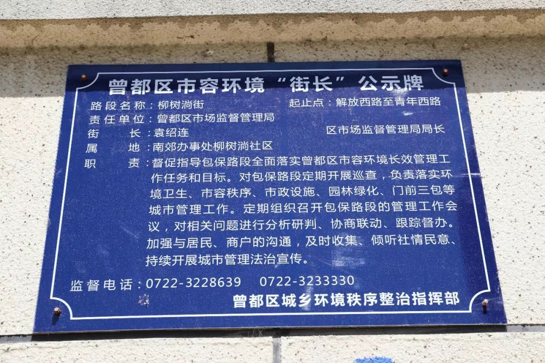 在曾都区城乡环境整治中,曾都区积极探索城市环境卫生治理新模式,建立办事处、社区、街道、部门“四位一体+”的联动模式,形成“街道吹哨、部门报到”工作机制,街长、路长、巷长制度就是其中的载体,从当上街长起,区市场监督管理局就紧盯打造精品街目标,摸清情况,理清思路,切实履行责任。