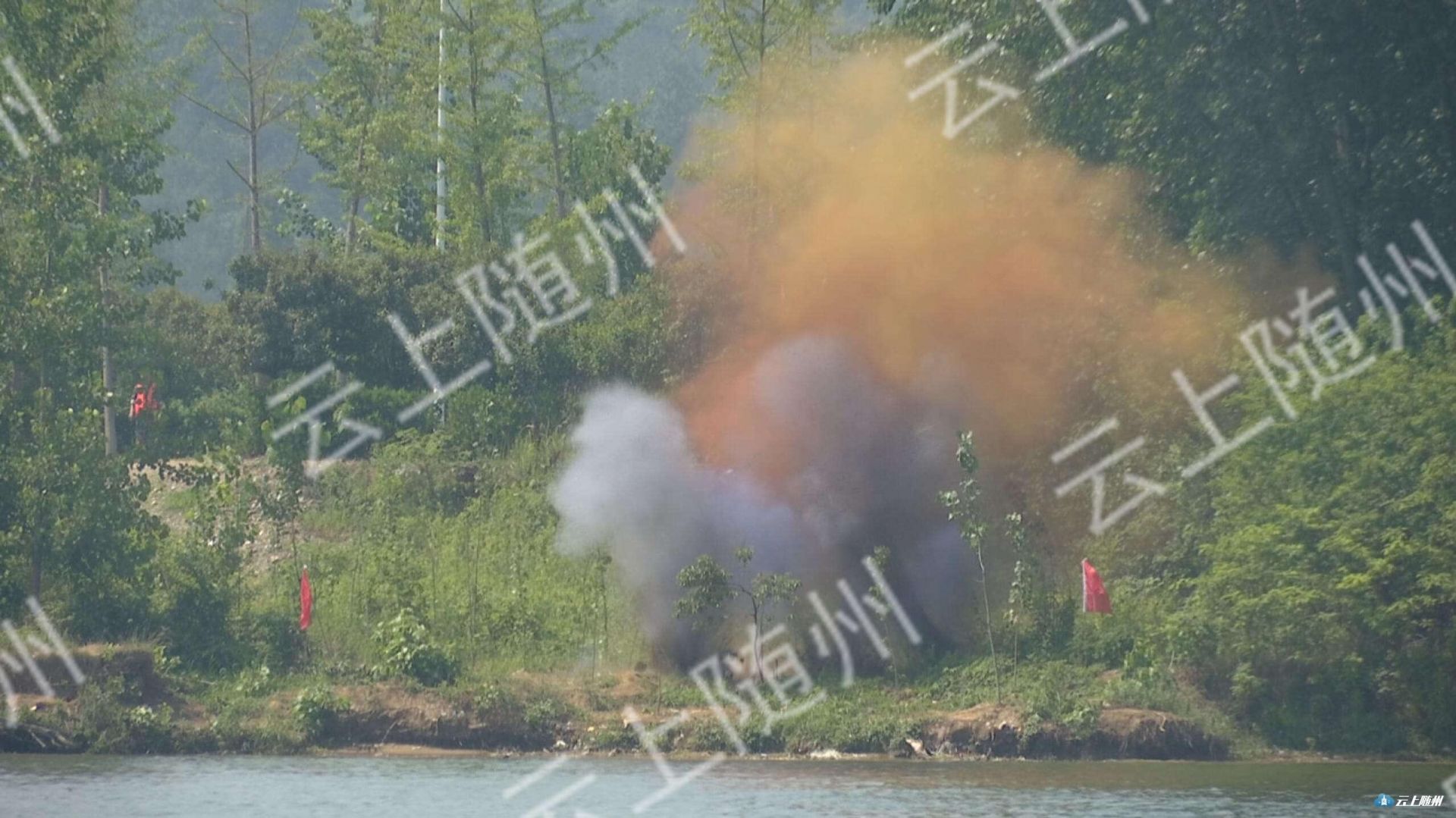 涢水长时间高水位运行,沿线堤坝出现多处险情,指挥部决定爆破分洪。泄洪水域人员紧急疏散完毕,爆破分洪完成。城区部分地段积水积水严重,市排涝抢险突击队携带应急防汛抗旱电源车、移动磁力泵、洋镐、铁锹等工具到达现场,完成积涝点排涝抢险行动,演练结束。
