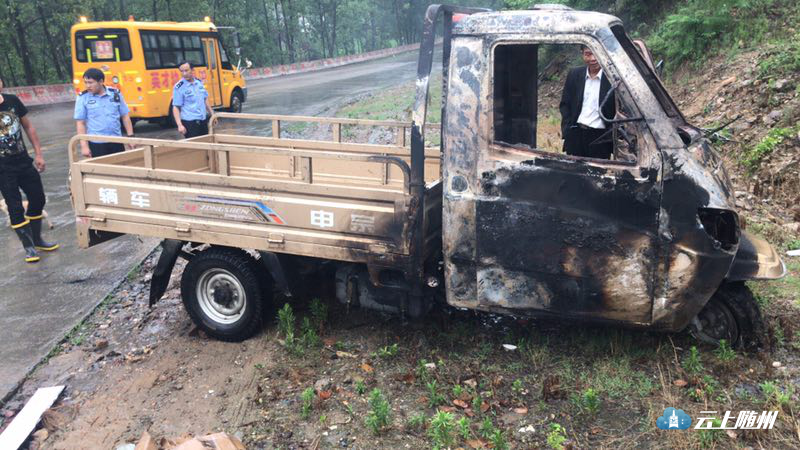 经初步调查,由于雨天路滑,加之车速过快,三轮摩托车行驶在该下坡拐弯路段时,司机急刹车致车辆侧翻滑行十多米,引起油箱破裂起火,所幸车上人员没有受伤。