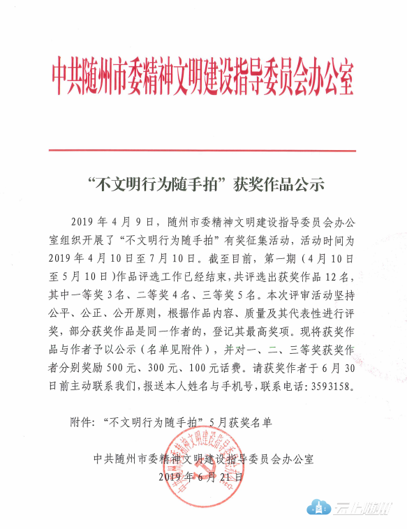 2019年4月9日,随州市委精神文明建设指导委员会办公室组织开展了“不文明行为随手拍”有奖征集活动,活动时间为2019年4月10日至7月10日。截至目前,第一期(4月10日至5月10日)作品评选工作已经结束,共评选出获奖作品12名,其中一等奖3名、二等奖4名、三等奖5名。本次评审活动坚持公平、公正、公开原则,根据作品内容、质量及其代表性进行评奖,部分获奖作品是同一作者的,登记其最高奖项。现将获奖作品与作者予以公示(名单见附件),并对一、二、三等奖获奖作者分别奖励500元、300元、100元话费。请获奖作者于6月30日前主动联系我们,报送本人姓名与手机号,联系电话:3593158。