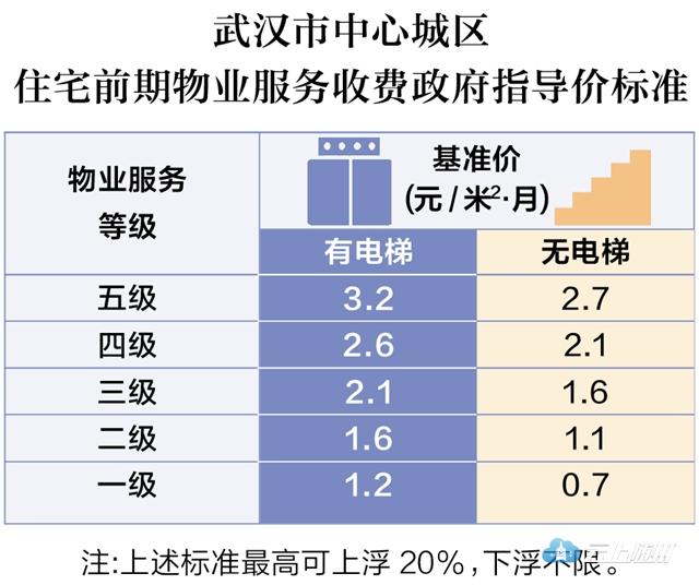 长江日报记者看到,前期物业费参照物业服务5个等级分别制定了5类基准价,并且按照有无电梯进行了分别定价,在基准价基础上最高可上浮20%。有电梯的,最低的“一级”物业服务基准价1.2元/平方米·月,最高的为“五级”3.2元/平方米·月。基准价最高可以浮动20%,这意味着最高前期物业服务费不能超过3.84元/平方米·月。据悉,目前武汉市场上新小区物业费一般每平方米2元多,收费3元4元的近两年增长比较明显,最高的超过每平方米6元。