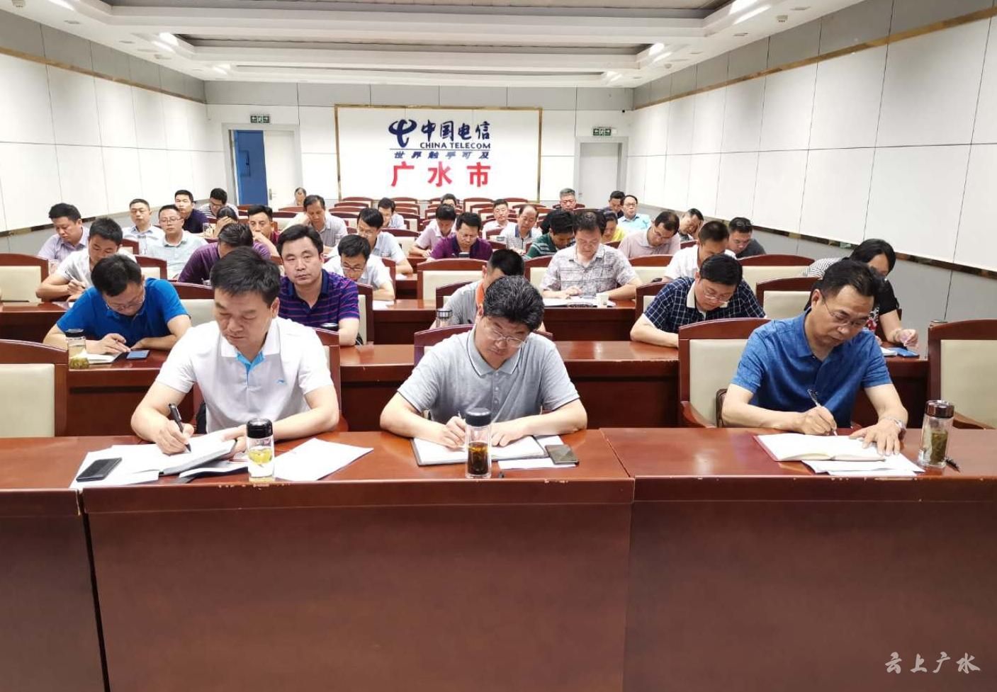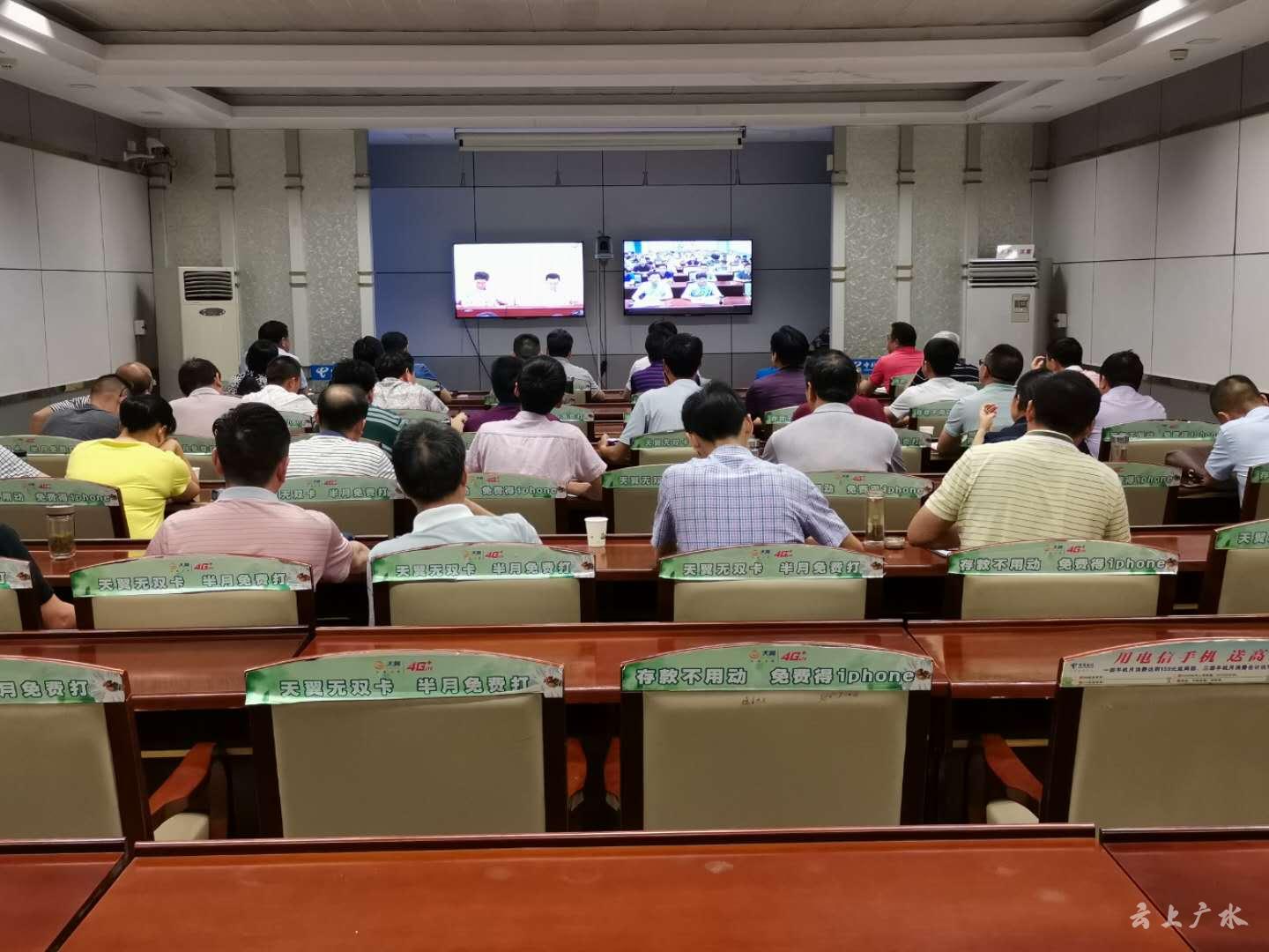 广水市市长田涛、副市长左扬在广水分会场收听收看电视电话会。