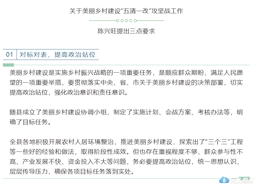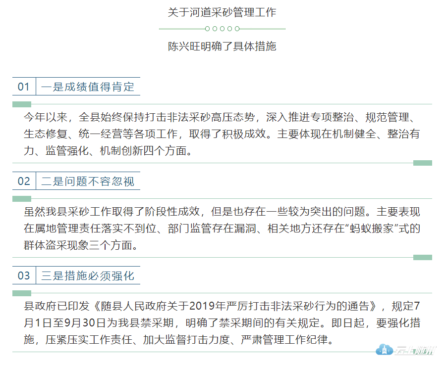 7月5日,随县美丽乡村建设“五清一改”攻坚战暨河道采砂治理推进会召开。推进会以电视电话会议形式开到镇村一级。随县县委副书记、县长陈兴旺强调,要深入贯彻落实中央、省、市决策部署,在随县上下全面打响村庄清洁行动夏季攻坚战,深入推进河道采砂管理工作,改善农村人居环境,加强生态环境保护,为推进绿色随县、旅居随县建设奠定坚实的基础。