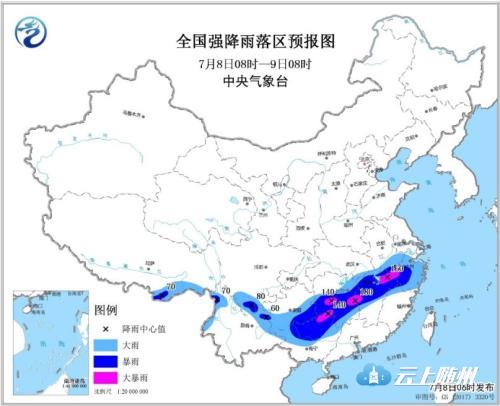 全国强降雨落区预报图(7月8日08时-9日08时)