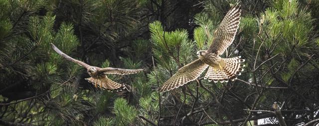 能这么快就看到红隼出现,让大家感到十分惊喜,然而更大的惊喜还在后面。只见一只红隼从落脚的树枝上一跃而起,展翅升空,翱翔于蓝天白云之间,突然,它的身边又出现了一只红隼,两只红隼在天空中忽远忽近,似乎是在追逐嬉戏,摄影爱好者赶紧用相机记录下这精彩的时刻。