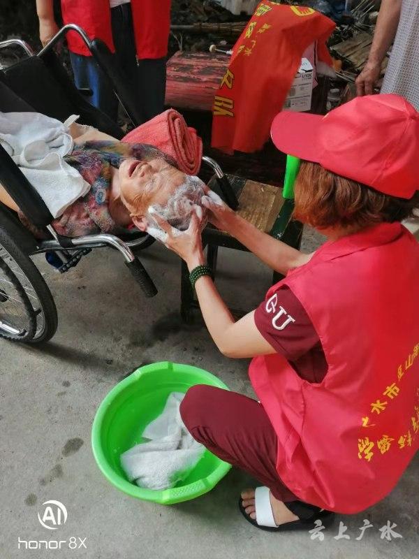广水市学雷锋服务队积极参加“爱满荆楚”活动,对应山街道办事处东关社区失独、独居、空巢老人进行心理疏导,康复训练、助浴、助法、送餐等救助。7月17日上午,广水市学雷锋服务队组织队员到东关社区跃进岭路89号,为77岁中风老人邓崇兰和行动不便的老伴杨维安洗头理发,打扫卫生。