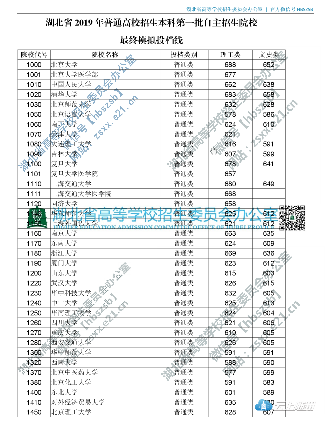 7月20日,湖北省招办公布了湖北省2019年普通高校招生本科第一批自主招生院校最终模拟投档线。