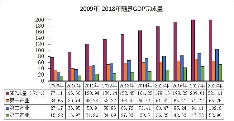 建县以来,随县经济取得长足发展,地区生产总值连续跨越:2011年跨上百亿台阶,达到120.94亿元;2017年达到209.01亿元,突破200亿大关;2018年达到221.01亿元,是2009年的2.9倍,年均增长13.5%。同时,随县三次产业结构由建县初的44.9:35.2:19.8演进为2018年的29.5:46.5:24,实现了由农业主导到工业成为经济发展主动力的历史性变革。随县在全省县域经济考核中持续保持进位态势,由2009年第78位跃升至2012年第48位,荣获“全省县域经济发展进位先进县”的称号;2017年按新县域经济考核方案提升至第19位,建县来累计上升33位。